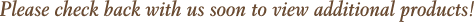 All of our products are not currently shown on this website. If you are interested in re-ordering our products or ordering other items you have seen at vendor shows or retailers, please contact us.